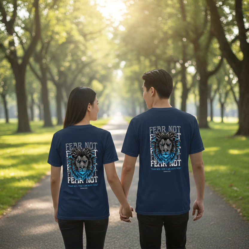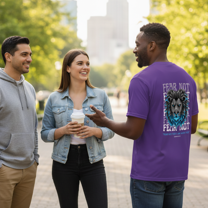This "Fear Not" Unisex T-shirt based on Isaiah 41:10, assures us that God is always with us. This tee is crafted from premium polyester with moisture-wicking, fade-resistant fabric. Features UPF44+ sun protection, reinforced seams, and a relaxed fit perfect for active wear. Made on-demand and available in the US.