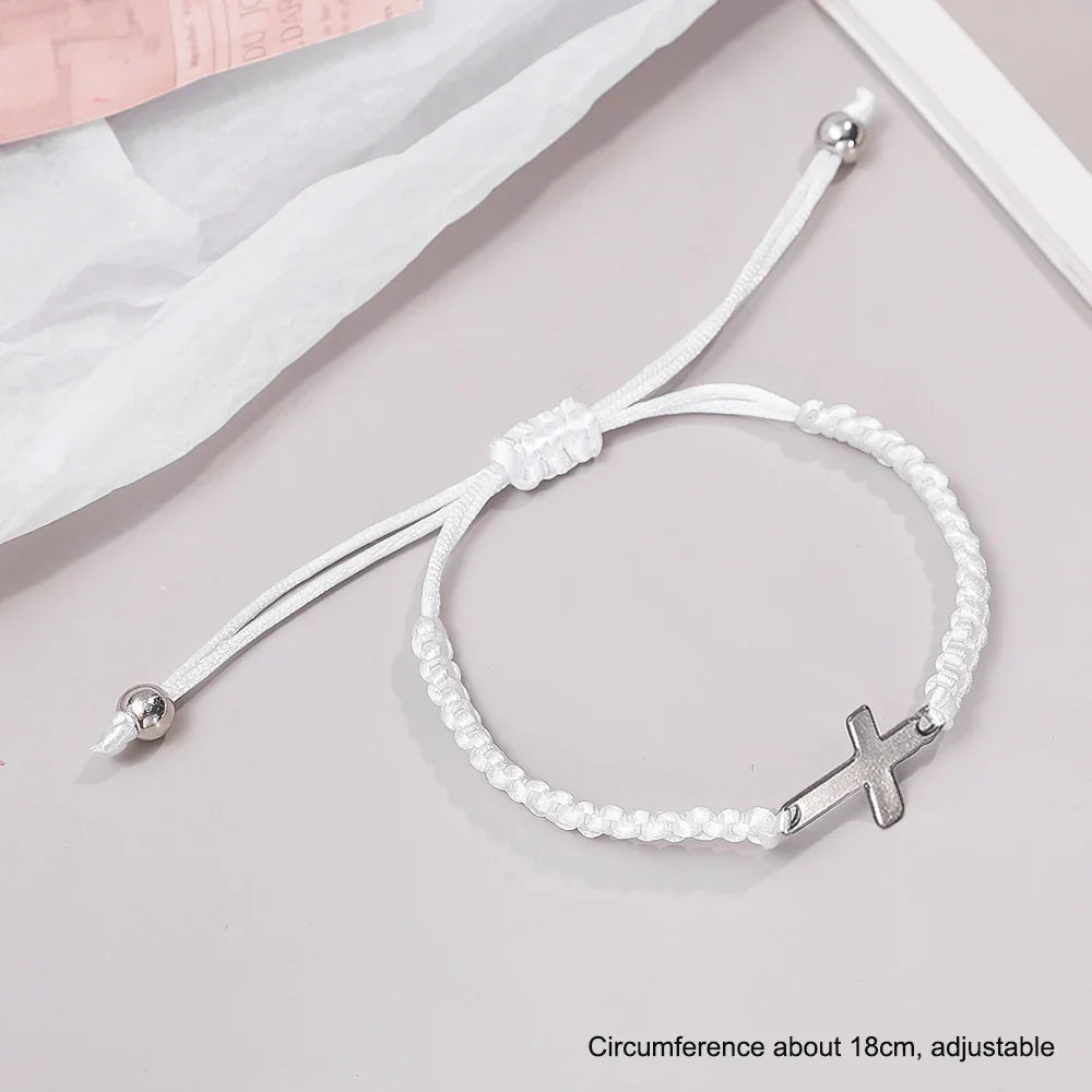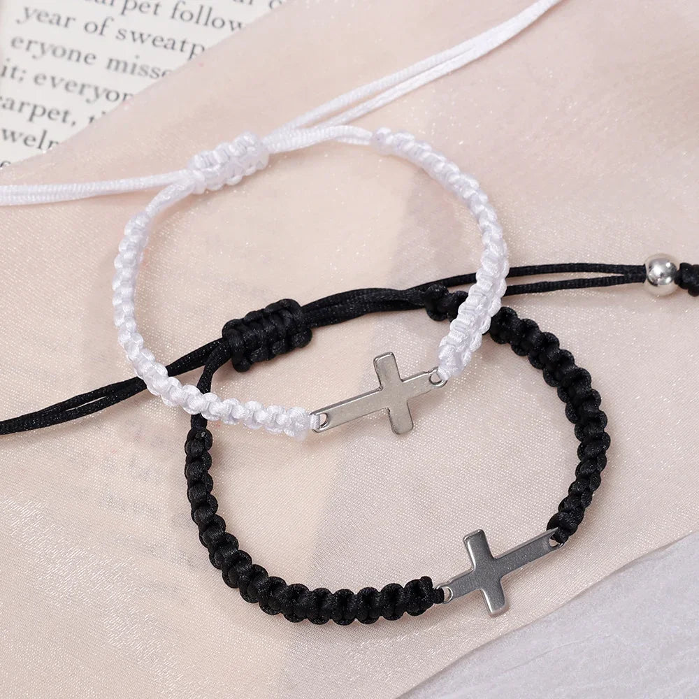 This stylish bracelet features a sleek cross design made from durable stainless steel and woven rope. Available in black or white, it effortlessly matches any outfit. Its adjustable fit ensures all-day comfort. Perfect as a meaningful gift for couples, it symbolizes love and commitment while offering lasting quality for everyday wear.