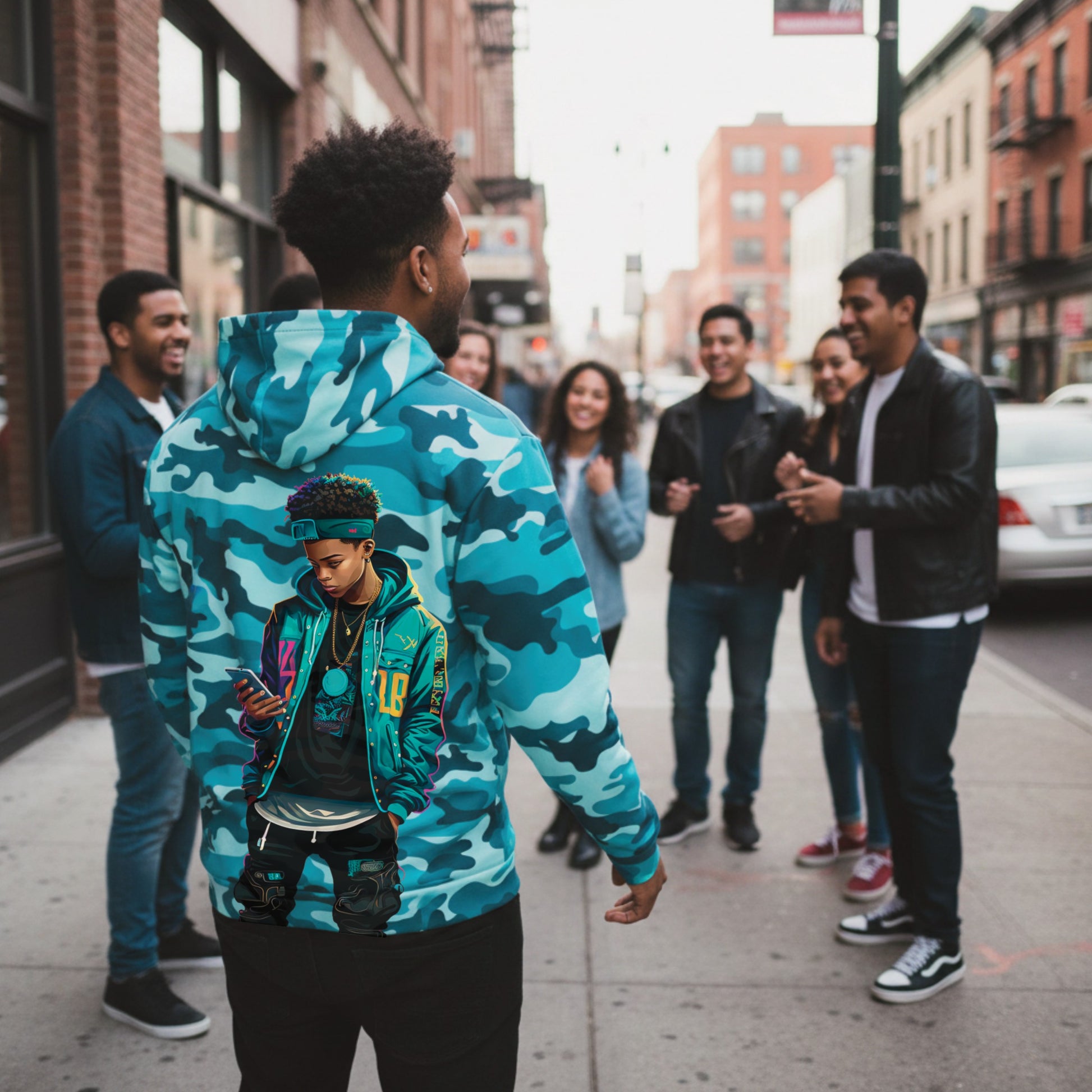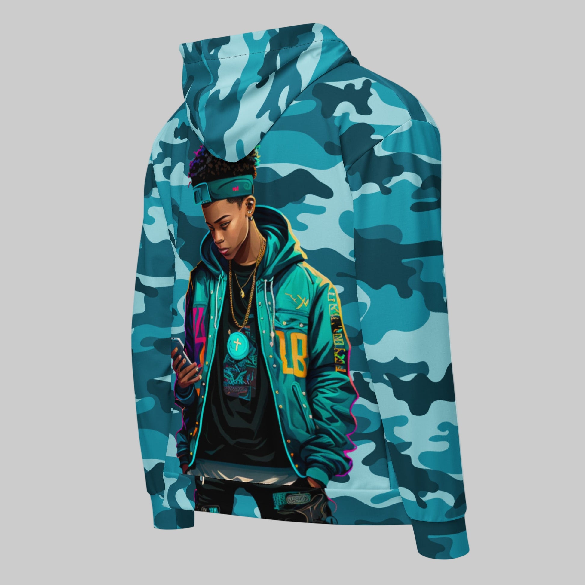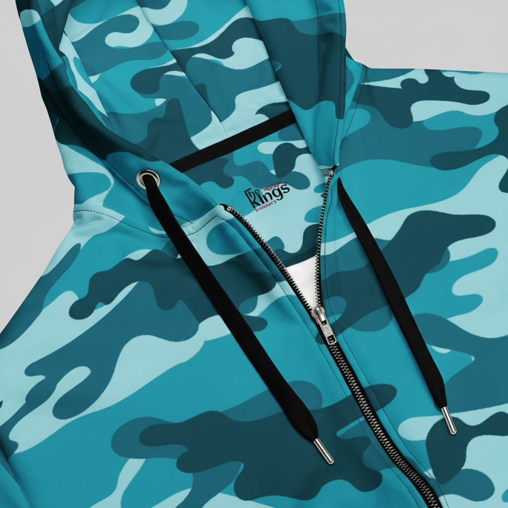 Meet the "Lifestyle" All Over Print Hoodie and layer up in style with this turquoise camouflage zip hoodie. Soft, cozy fabric with a bold all-over print makes this a standout piece for any wardrobe. Full-zip front, adjustable hood, and kangaroo pockets combine comfort with functionality. Ideal for cool-weather workouts or everyday wear.