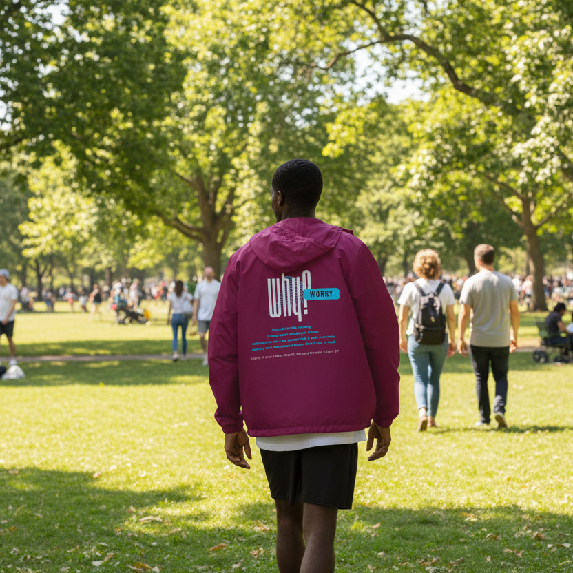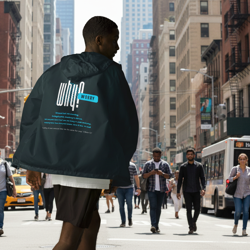 This "Why Worry" windbreaker is as light as a feather, symbolizing the lightness that comes from casting all your cares on God, as found in 1 Peter 5:7. Stay protected from the elements with water-resistant fabric and a comfortable, versatile fit. Features a three-panel hood, secure pockets, and an adjustable waistband for all-day wear.