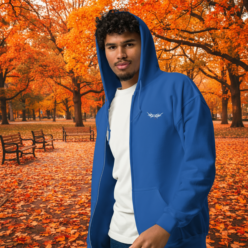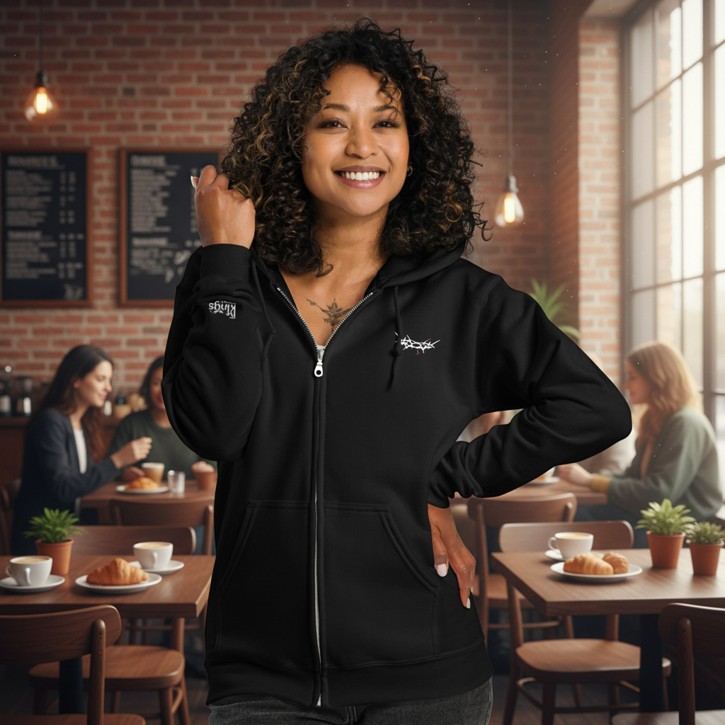 The embroidered "King's Crown" unisex zip hoodie offers cozy fleece warmth and a durable metal zipper for everyday comfort. It includes front pockets and an adjustable hood for a practical fit. Pair with the joggers. Made from a soft cotton-polyester blend, it resists piling and lasts through wear. Made to order for you—expect a slightly longer delivery time, but you're supporting sustainable production with zero waste. Thank you for choosing thoughtful shopping!